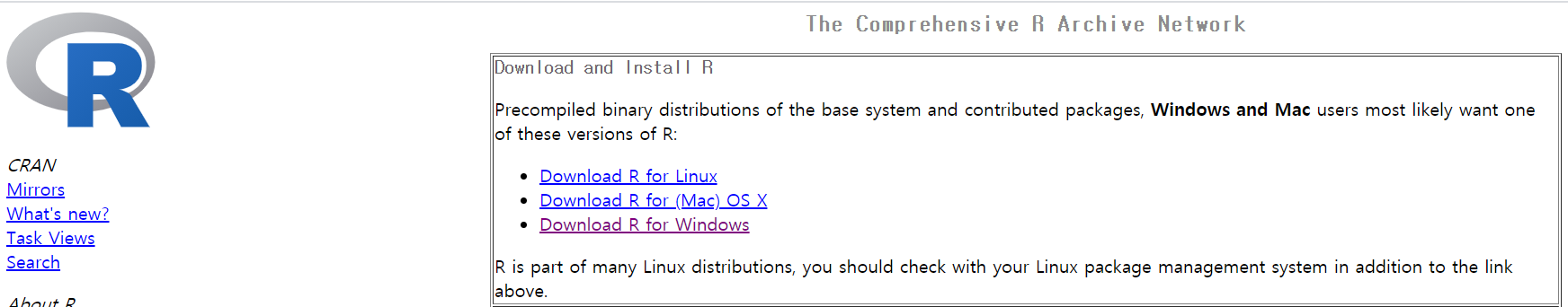 이후 아래와 같은 화면이 나오는데, 이중에서 본인의 운용체계에 맞는 것을 설치하면 된다. 예를 들어 리눅스를 이용하는 사람은 첫번째 있는 Download R for Linux을 클릭하는 것이다. 나의 경우 windows 운용체계를 사용하기 때문에 세번째 있는 Download R for Windows을 클릭했다.