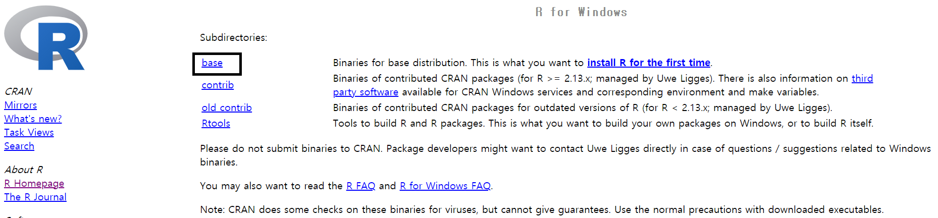이를 클릭하면, 아래와 같은 화면이 나오는데, R을 처음 설치하는 것이라면, 그냥 검은 블록으로 표시되어 있는 base을 클릭하면 된다.