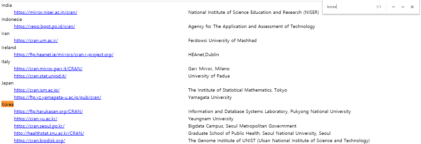 검은색 블럭화 되어있는 Download 창에 CRAN을 클릭하면, 국가이름이 나오고 그 아래 해당 국가에서 제공하고 있는 사이트 들이 나온다. 아마 이 블로그를 보고 있는 사람은 한국인일 가능성이 높으므로, ctrl +F 을 활용하여 korea을 쳐보자(혹시나 한국에서 다운받는게 아니라면, 해당 국가의 이름을 쳐서 들어가면 된다). 한국의 경우 현재 부산대, 영남대, 서울 빅데이터 캠퍼스, 서울대, unist에서 제공하는 사이트들이 있다. 이중 아무거나 클릭해서 들어가면 된다.