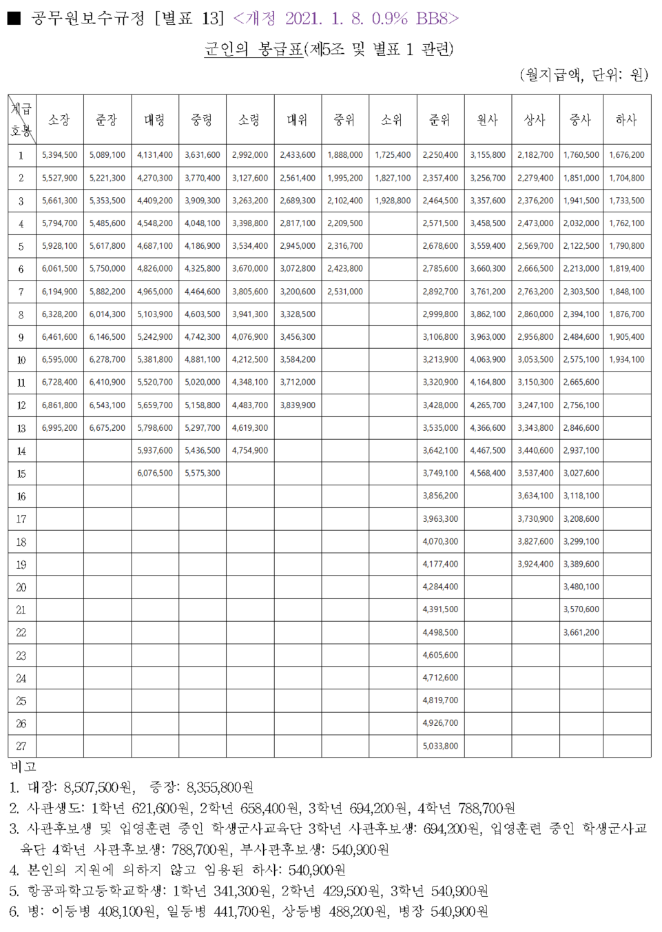 21년 기준으로 하사 1호봉은 167만원/ 소위 월급은 172만원이다.